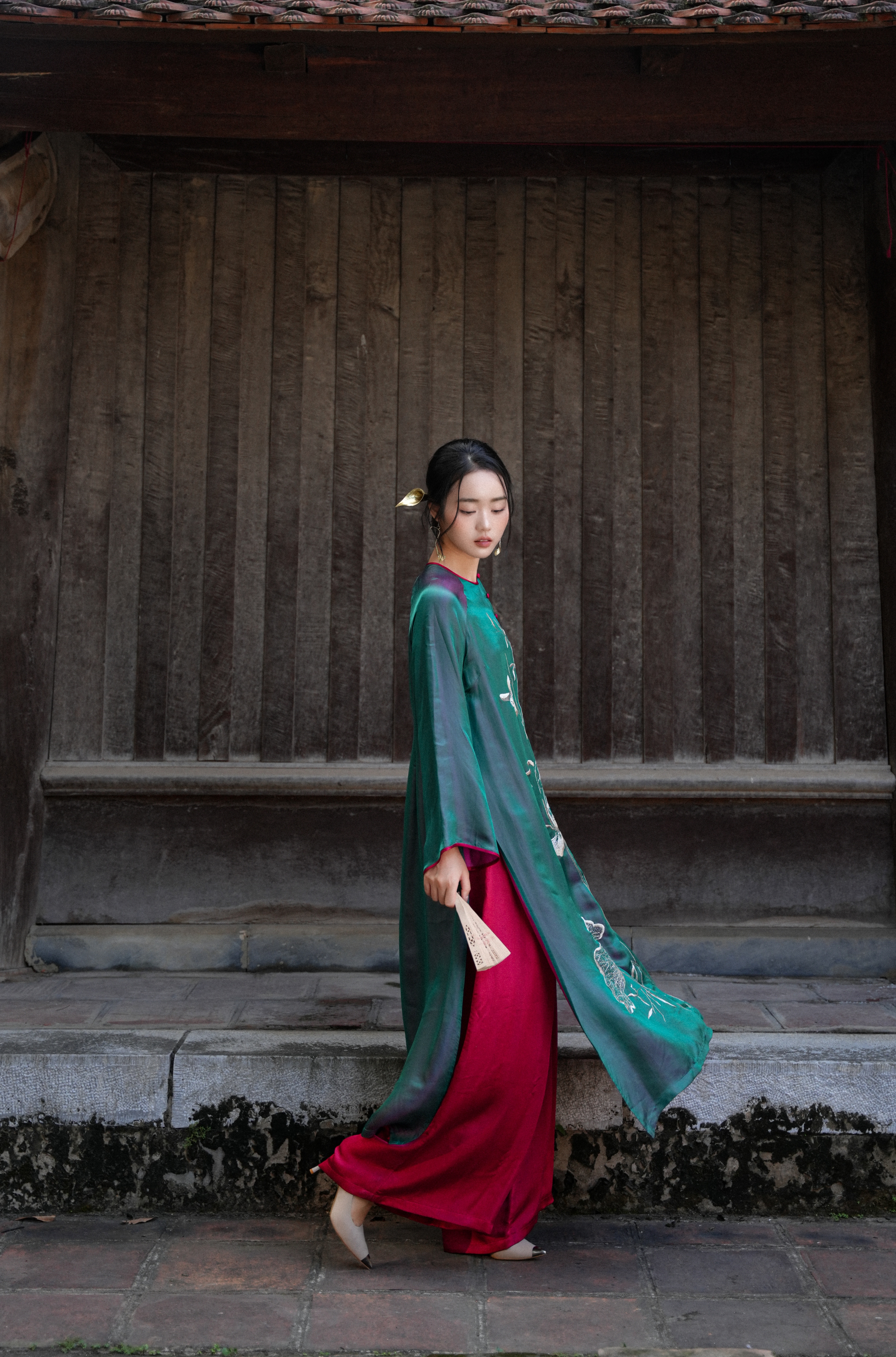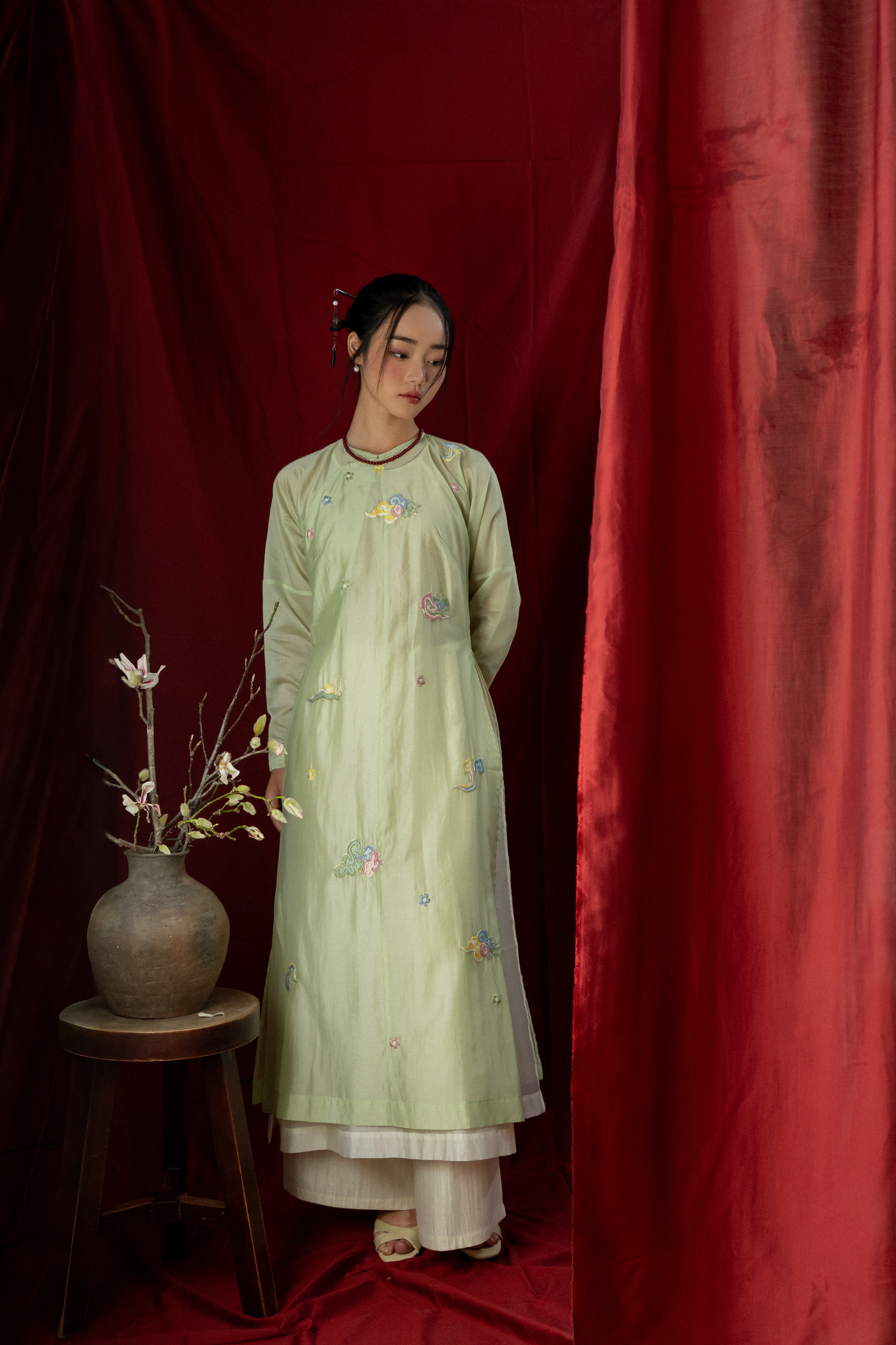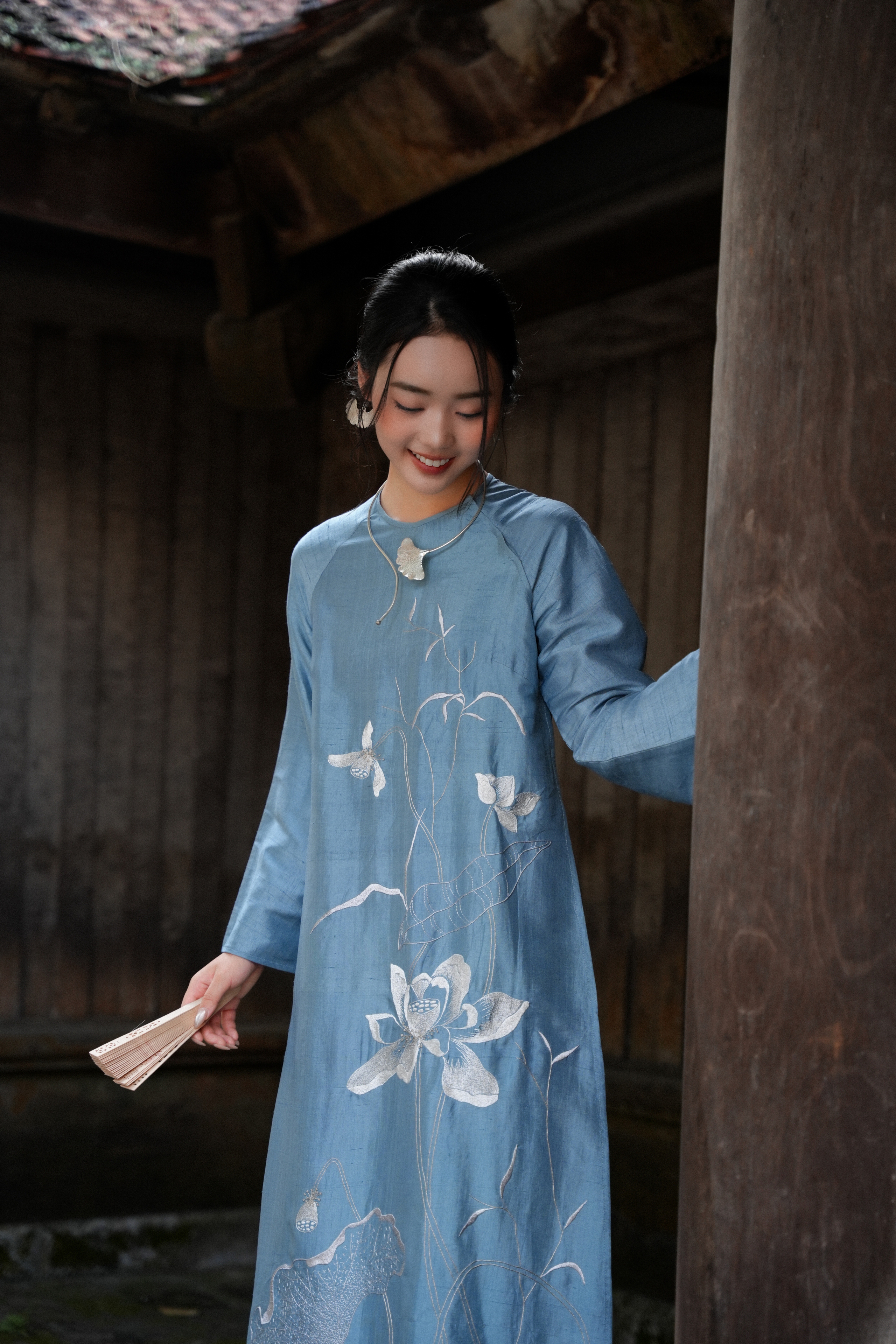 Áol dài dáng ngũ thân cổ tròn: các đường tà được xử lý khéo léo, giữ cho tơ có độ rủ tự nhiên; sắc tơ Nha Xá nổi bật độ bóng mờ đặc trưng của lụa