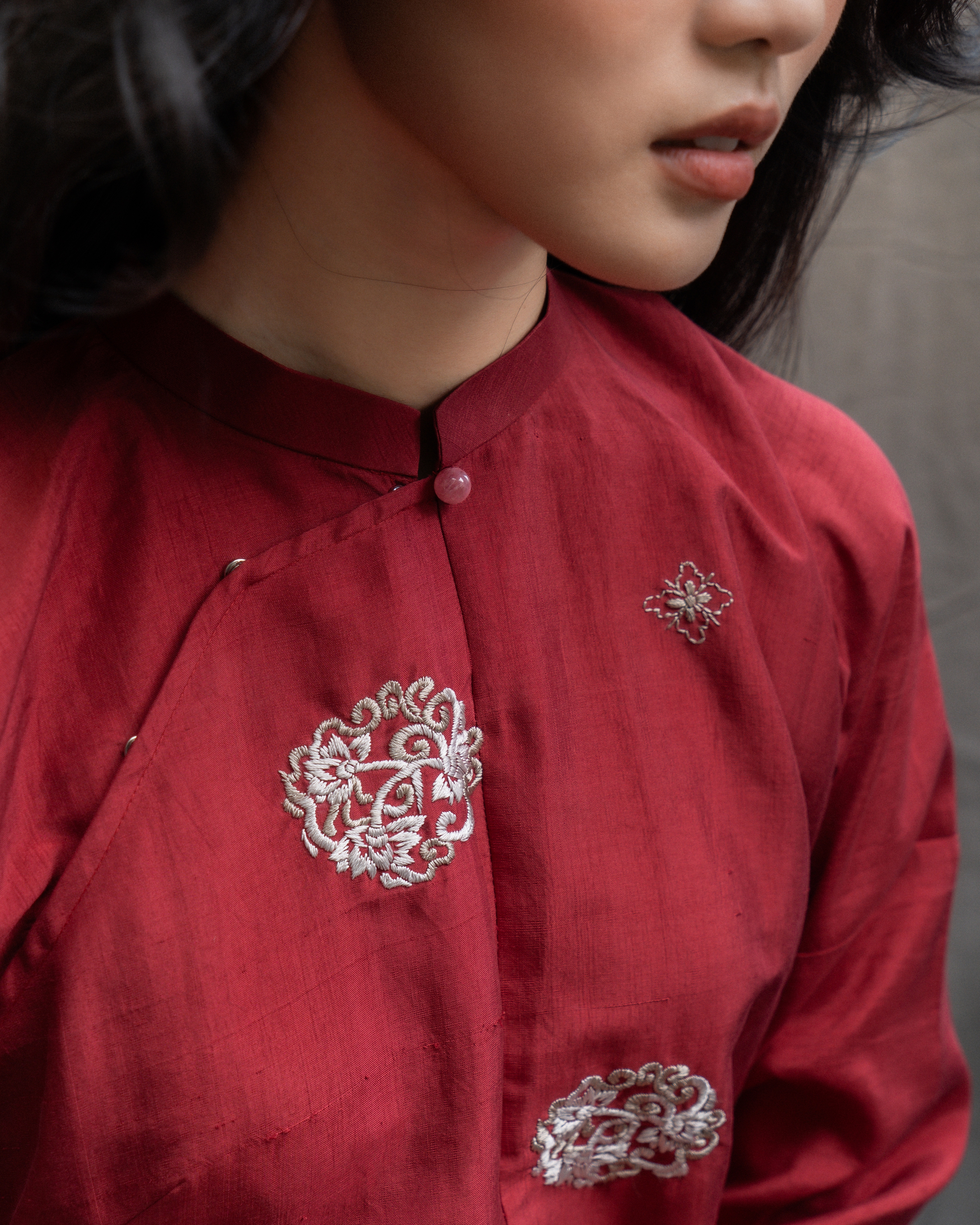 Kỹ thuật thêu nổi 3D tương phản với độ mịn của nền tơ dệt thủ công, tăng thêm hiệu ứng ánh sáng độc đáo. Điểm nhấn đá quý Thạch Anh cùng tông tạo sự cân bằng hài hòa và vẻ đĩnh đạc trang trọng